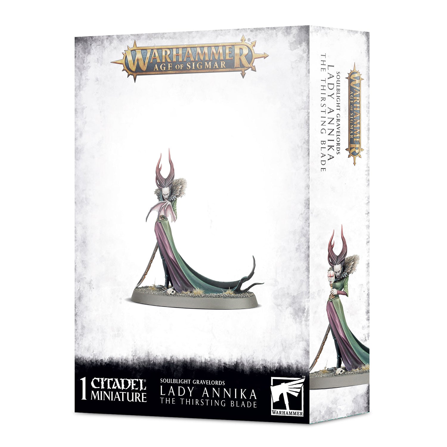 Lady Annika offers the Soulblight Gravelords a powerful presence in close combat, bolstering the effectiveness of her undead hordes while tying up swathes of enemy forces on her own. Armed with a sinister artefact her sword is jey to her effectiveness, absorbing the strength of her fallen foes to enable her continued bloodlust throughout the maelstrom of battle.