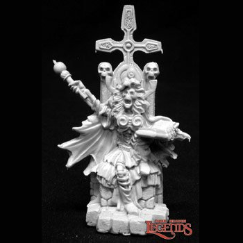 Reaper Miniatures 02068: Lucrella Lich Queen sculpted by Bob Ridolfi a fantastic metal miniature for your gaming table of a Lich Queen upon her throne with a book in one hand and a scepter in the other.