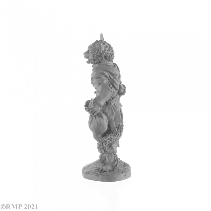 Catfolk Rogue from the Dark Heaven Legends metal range by Reaper Miniatures sculpted by Julie Guthrie. A catfolk tabaxi metal miniature dressed in human clothing holding a sword in one hand and a bag in the other. A great miniature for your gaming table.