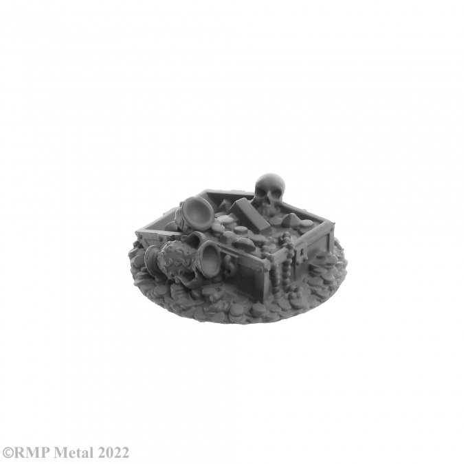 Treasure Pile from the Dark Heaven Legends metal range by Reaper Miniatures. This pack contains a treasure pile featuring a skull, coins, chest and goblets to help you dress your dungeons or gaming table.