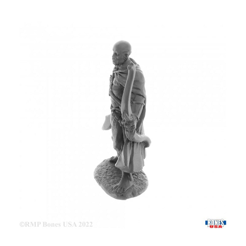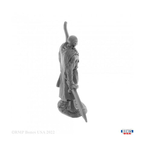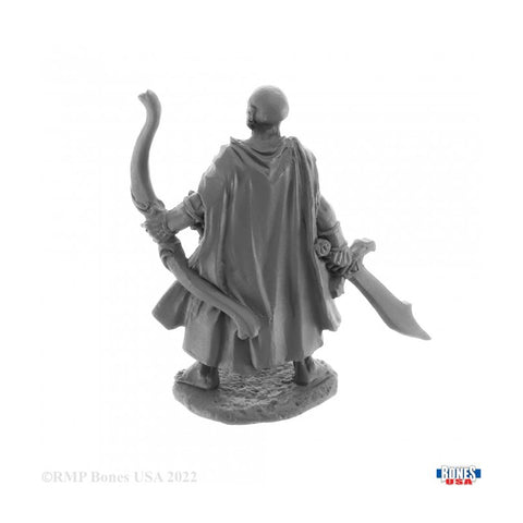 This incredibly detailed RPG miniature from the Reaper Bones USA range depicts Ogana the Savannah Ranger in hard plastic that is perfectly suited to Dungeons & Dragons, Pathfinder and any number of other Fantasy genre role playing games, Ogana is a versatile character that could represent a Fighter, Warrior or even Ranger; suited but not booted, he is armed with a scimitar, bow and arrows and a dagger at his side and is wearing a billowing cloak with a bare chest and legs. Sculpted by Julie Guthrie