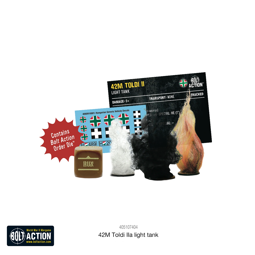This box contains one 42M Toldi IIa Light Tank, cast in resin & metal, with waterslide decal sheet, Bolt Action Order Die, Bolt Action: Third Edition vehicle stat card, and vehicle damage markers.