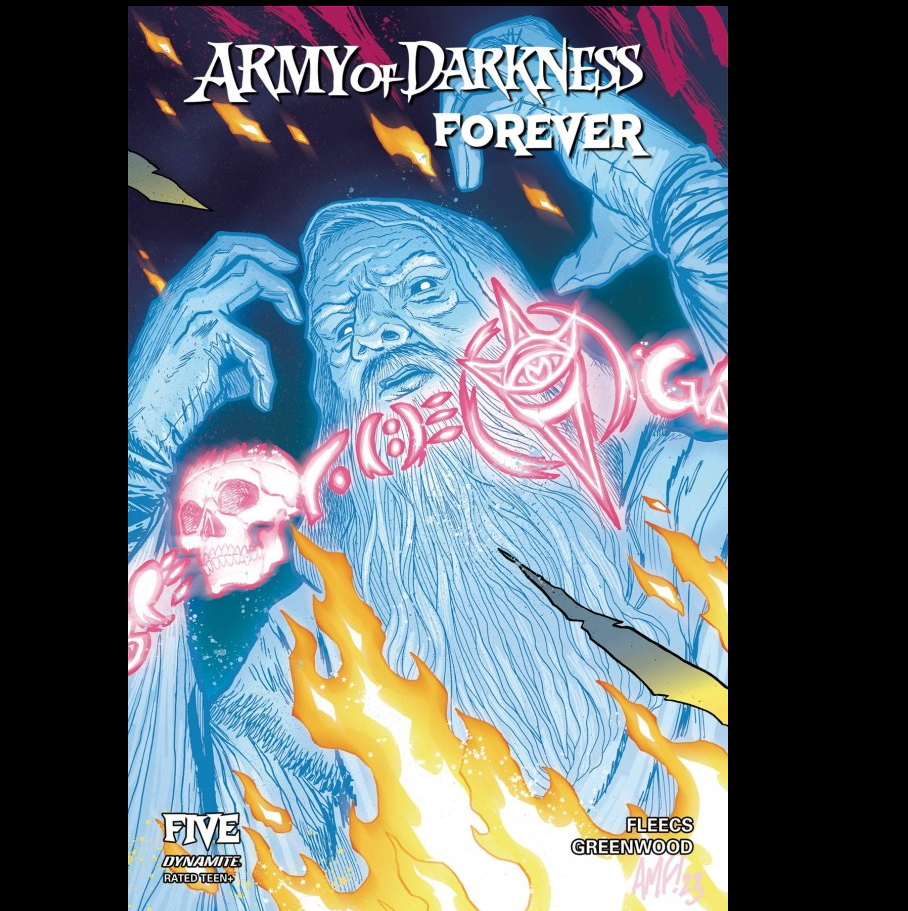 Army of Darkness Forever #5 from Dynamite Comics. The Legendary Ash Williams is back destroying Deadites past, present and future. Issue #5: Bad Ash continues to scheme in the present day, while in the future, Ash and the Wiseman seek the last piece of the Necronomicon. And in the past, Sheila makes a deadly discovery which threatens all space and time... for real!