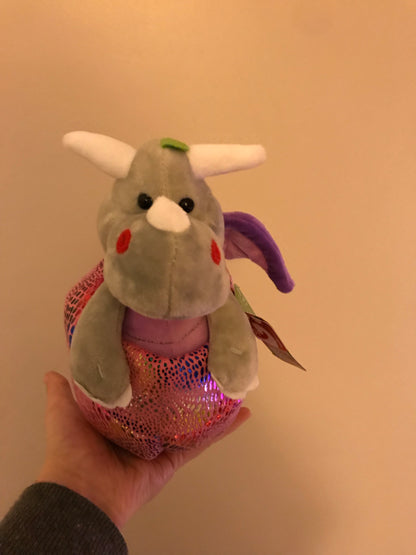 An adorable grey baby Dragon with purple wings nestled in a pink shiny rainbow accent egg. You can keep your baby safe in its egg or remove it for a even snugglier cuddle.