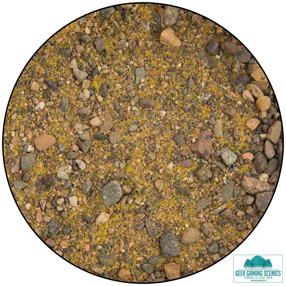Base ready arid grasslands by Geek Gaming Scenics is a ready mixed basing material for your tabletop gaming and hobby basing needs with a mix of sand, gravel, saw dust, static grass and aggregates to give a dry land look great for your wargaming table, RPG setting and more.