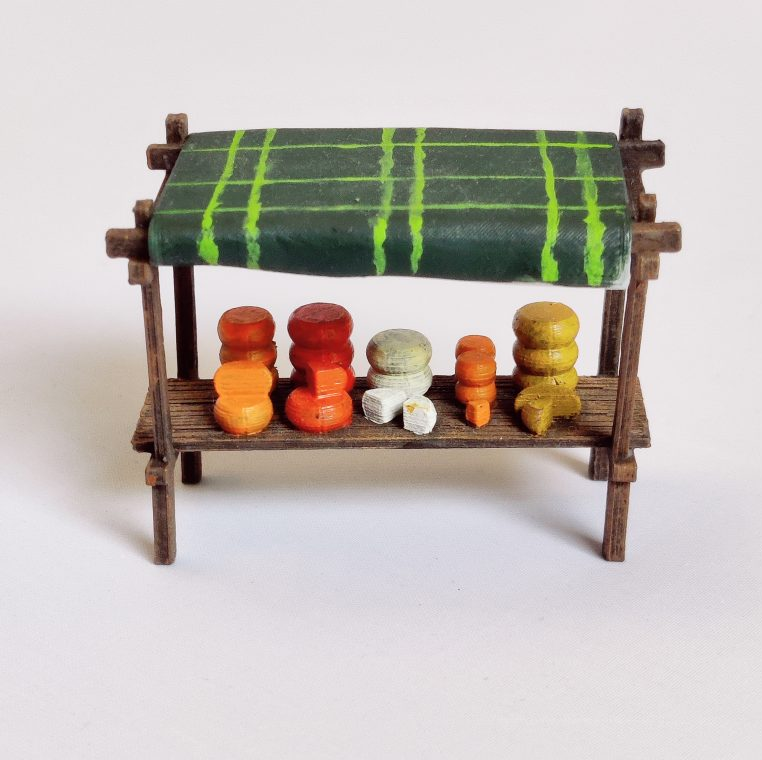 A Cheese Market Stall by Iron Gate Scenery in 28mm scale produced in PLA representing a wooden stall selling wheels of cheese for your town scenery, dioramas, RPGs and other tabletop games.