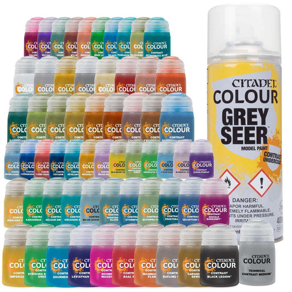 Treat yourself to the entire Citadel contrast range, including the amazing new additions and save with our Mega bundle. This bundle contains one 18ml pot of each of the 61 Contrast Paints in the range plus a pot of Contrast Medium and a can of the New Grey Seer spray primer.