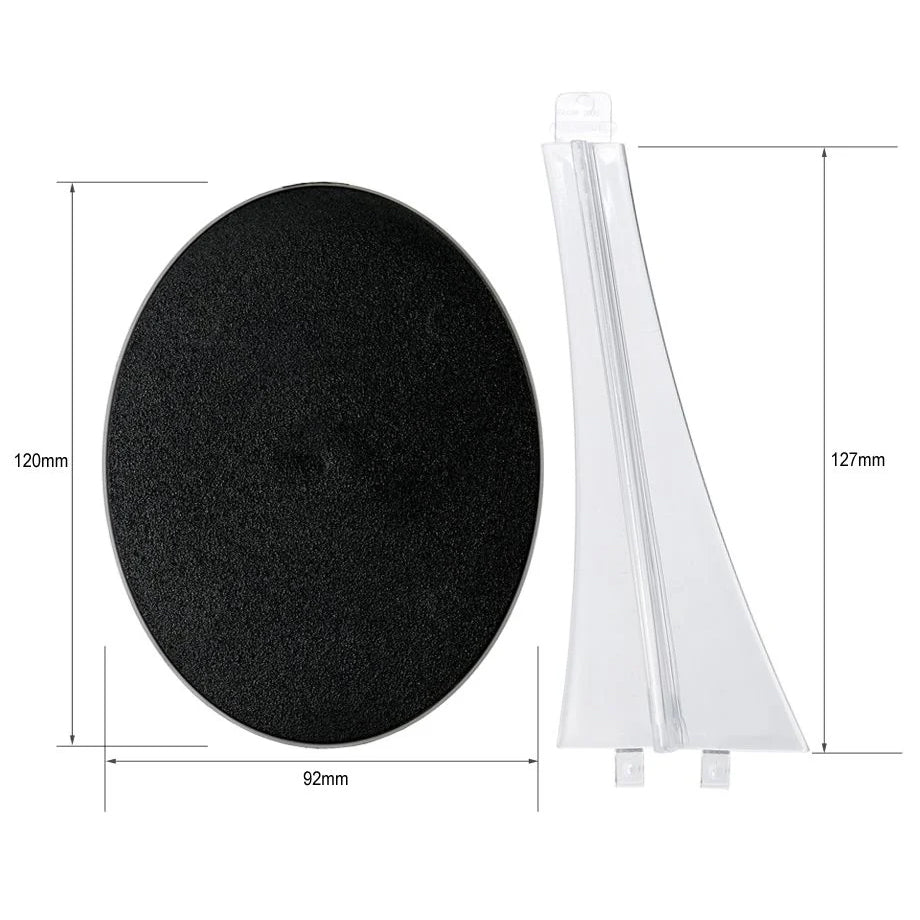 Each pack includes one large black oval base measuring 120 x 92mm and a clear acrylic flight stem.