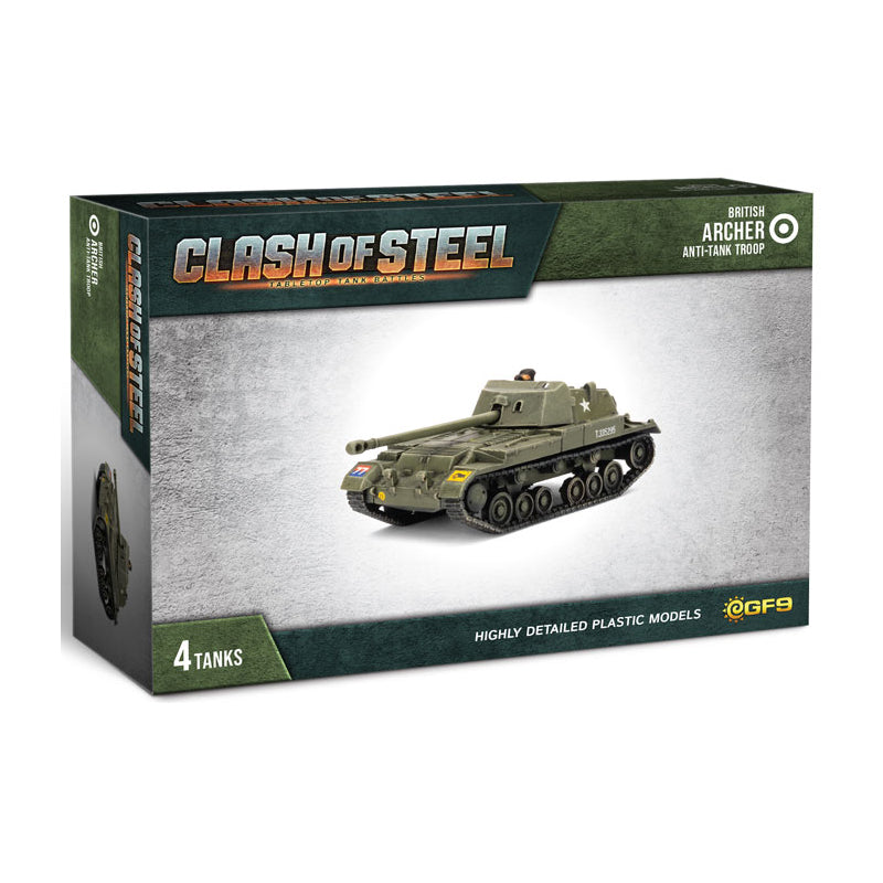Designed to aid British forces in their fight against German armour, the Archer was created after several other designs had been rejected. Its compact size and low profile make it difficult to detect, providing crews with the opportunity to take a few shots before moving to a new firing position. This box includes 4 miniature Archer Tanks, perfect for use in the Clash of Steel tabletop game.