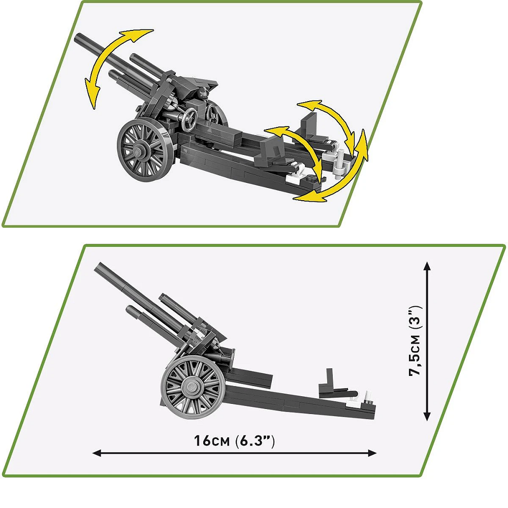 This model is developed in a 1:35 scale to match the rest of the COBI Historical Collection, featuring a movable barrel and a photo-realistic design that captures the essence of the original howitzer. The set includes a figure of a German artilleryman armed with a P08 Parabellum pistol, adding authenticity to your display. Additionally, the kit comes with a plate featuring the name of the model.