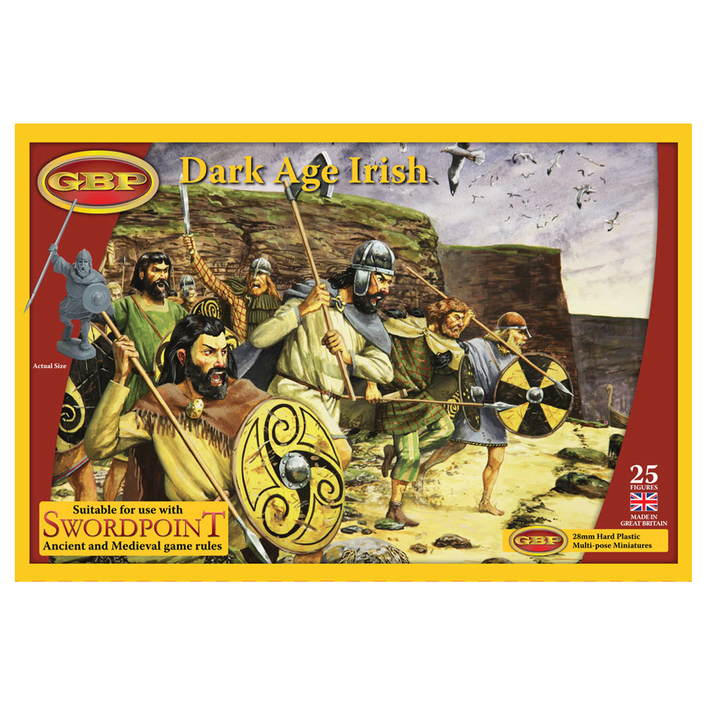 This Dark Age Miniatures boxed set contains the parts required to assemble 25 warriors representing the Kern, Dark Age Irish fighters. These plastic miniatures are approximately 28mm scale and are perfect for wargames using the Swordpoint rules set.