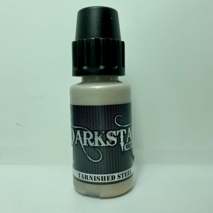 A 17ml bottle of Darkstar Molten Metals Tarnished Steel a water based acrylic metallic paint. We know it can be hard to see the colour on different digital screens so we would describe this paint as a mid bright, mid grey tone steel colour paint. Used by Mr MLG himself Darkstar Molten Metals can be polished once dry to achieve an even brighter finish.