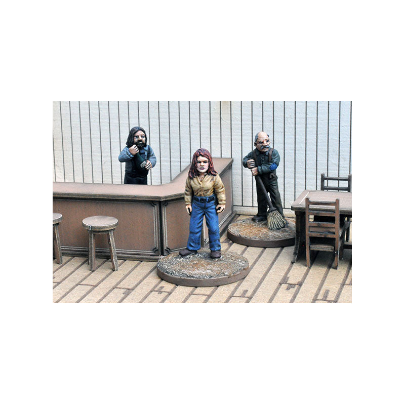 This Dead Man's Hand blister pack contains a trio of detailed white metal miniatures, depicting civilians you might find at Rogan's Bar, ideal for depicting unfortunate citizens caught in the crossfire of your heated skirmishes, dressing your battlefield with realistic townsfolk.