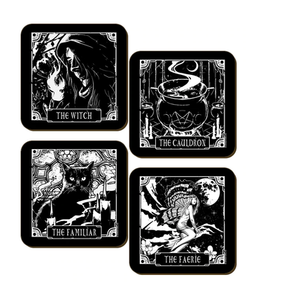 Set of four square monochrome coasters featuring The witch, The cauldron, The familiar and The faerie with wonderful art work they would make a great gift or feature on your gaming table.