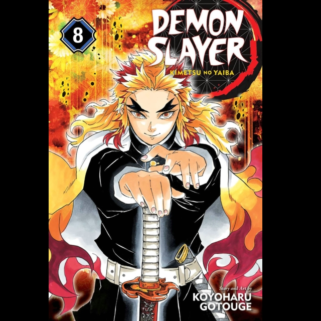 Demon Slayer Kimetsu no Yaiba Vol. 8 by Koyoharu Gotouge, a 192 page paperback manga graphic novel. In Taisho-era Japan, Tanjiro Kamado is a kind hearted boy who makes a living selling charcoal, but his peaceful life is shattered when a demon slaughters his entire family.