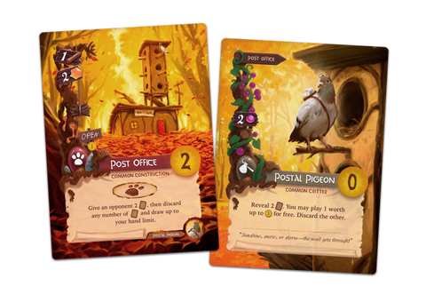 b) Play a Card: Each player is building and populating a city; a tableau of up to 15 Construction and Critter cards. There are five types of cards: Travelers, Production, Destination, Governance, and Prosperity. Cards generate resources (twigs, resin, pebbles, and berries), grant abilities, and ultimately score points. The interactions of the cards reveal numerous strategies and a near infinite variety of working cities.
