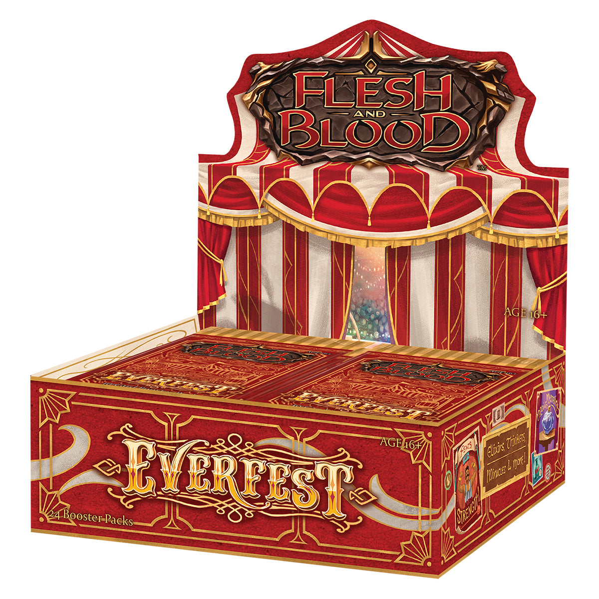 Step right up and immerse yourself in the most entertaining carnival on Rathe as the Everfest Flesh and Blood expansion seeks to empower players with powerful new cards and synergies. Each booster pack contains one Premium Rare (Cold Foil or Rainbow Foil), 2 Rare or Higher (Rare/Majestic/Legendary), and seven Commons.