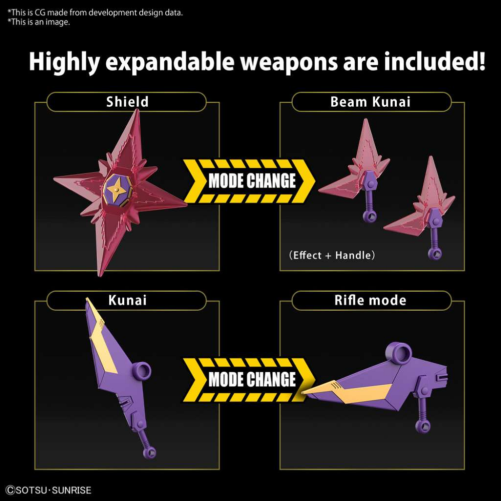 The F-Kunoichi Kai model allows you to switch out face parts and attach the beam shawl to recreate its high power form, providing versatility in display options. Additionally, you can switch parts to equip a GM head, adding a unique twist to your Gundam collection. The kit also features interchangeable handle parts, enabling you to switch between Dai Kunai mode and VSBR mode, enhancing the model's combat capabilities.