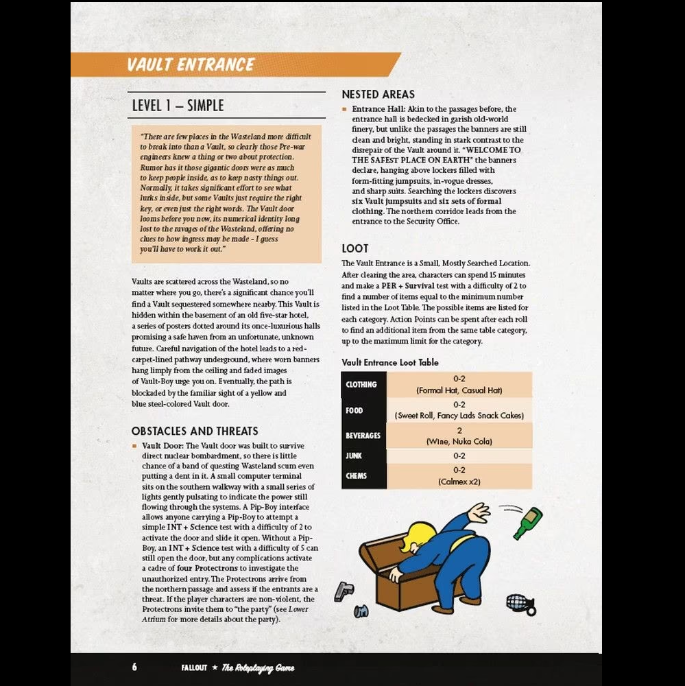 Also included is a companion booklet containing short scenarios, encounters, scavenging location details and additional information for use with Fallout The Roleplaying Game and its supplementary Gamemaster’s Toolkit. The pack supports both structured play and custom adventures, giving Game Masters the flexibility to run the included quest or design their own twisted Vault Tec experiment.