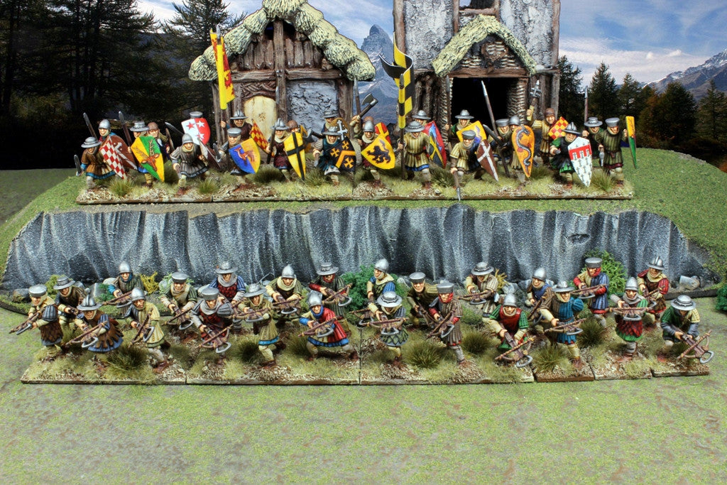 This box enables you to build up to 32 medieval infantry soldiers of the 12th13th century. Several weapon options like spears, swords, axes, maces and crossbows are included. You'll be able to build up to 24 Crossbowmen and/or up to 32 Foot Sergeants figures. Figures are supplied unpainted and require some assembly.