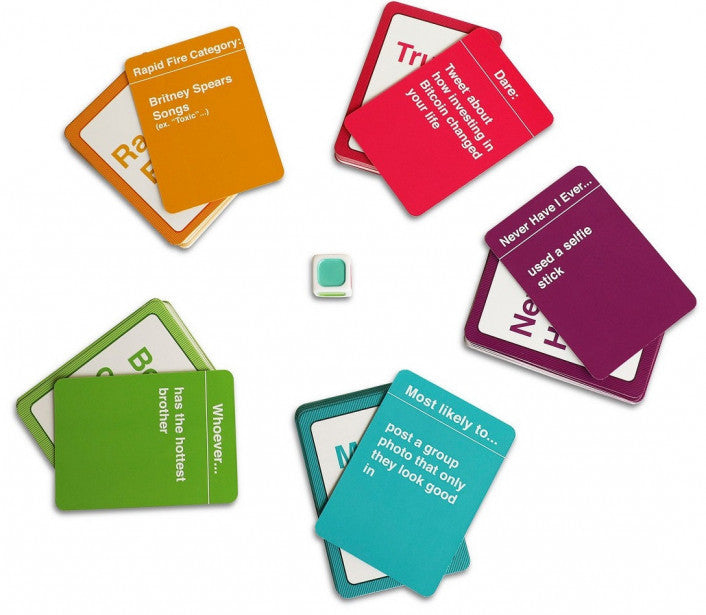 - - Contains 100 'Truth or Dare' cards, 100 'Never Have I Ever' cards, 100 'Rapid Fire' cards, 100 'Best of the Best' cards, 100 'Most Likely To' cards, and one beautifully cubed die
