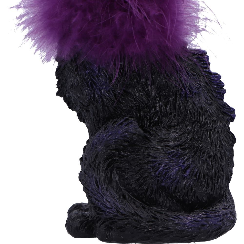 Furgus the black cat figurine being fabulous and wearing a purple boa with pride. A wide grin and bright yellow eyes add to the delightful charm of this characterful ornament.