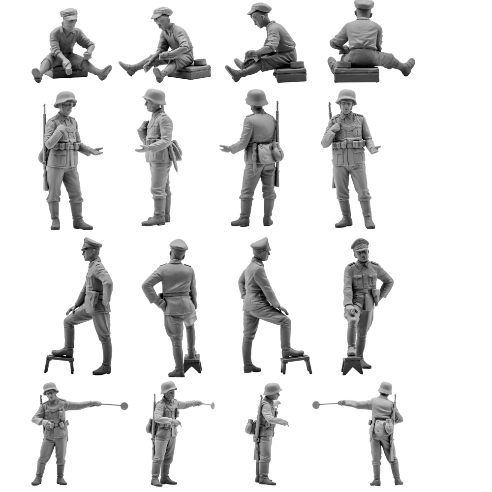 Detailed Figures: Assemble a civilian boy shoe-shiner and a German officer having his shoes shined. Two German soldiers are depicted in a relaxed, chatting stance, one holding a cigarette.