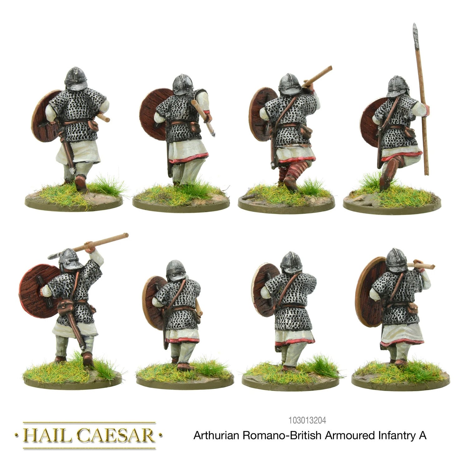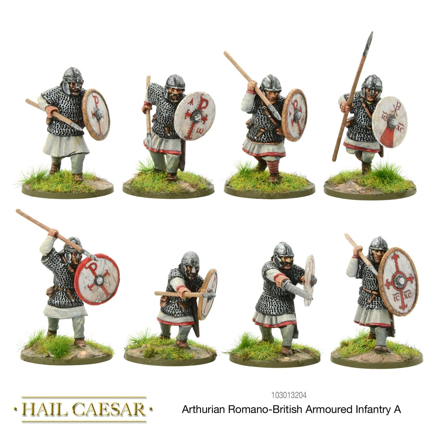 This blister pack includes 8 Arthurian Romano-British armoured infantry, equipped with spears, shields, and chainmail, perfect for serving as the primary unit in any Romano-British army.