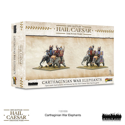 War Elephants! No Carthaginian army is complete without them, and you can never have enough in your games of Hail Caesar Epic Battles – this boxed set is the perfect way to add even more pugnacious pachyderms to your ranks! Containing four stunningly detailed multi-part plastic elephants and crew, no Carthaginian commander should ever be without their War Elephants!