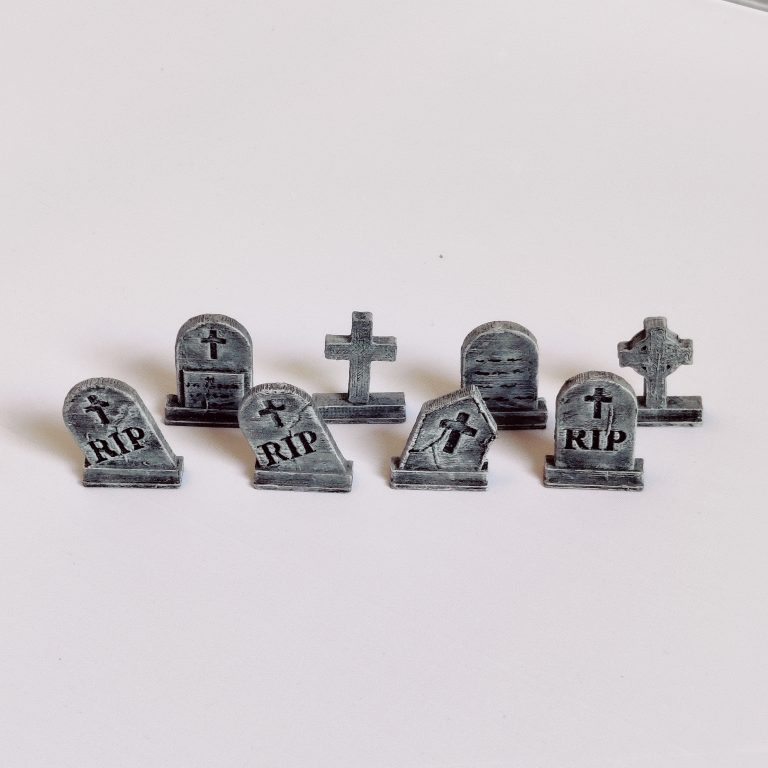 A pack of grave headstones by Iron Gate Scenery printed in PLA to 28mm scale making a great edition to your Halloween diorama, RPGs, tabletop games and more.
