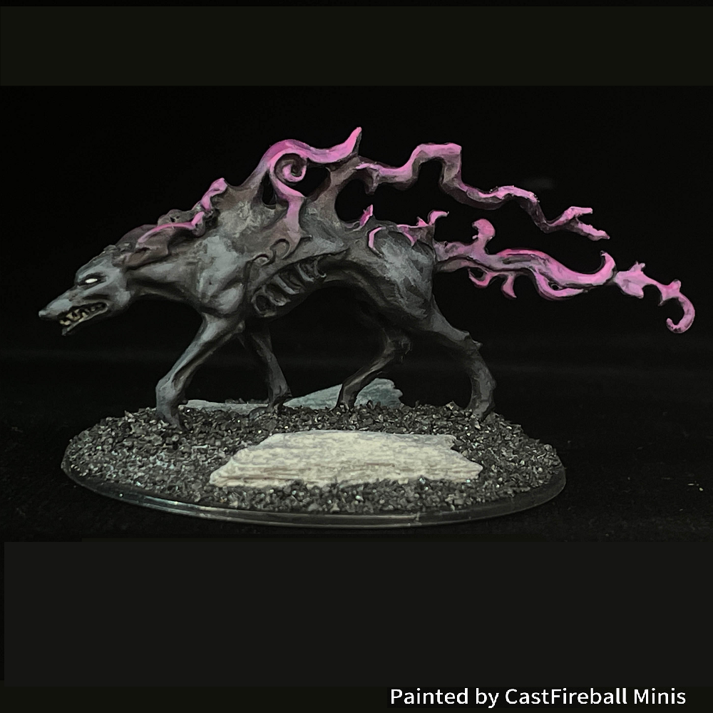 Reaper Miniatures Hound Of Judgement, a metal gaming miniature for your gaming table of a stalking canine with magical smoke billowing from its body as it hunts for in justice.