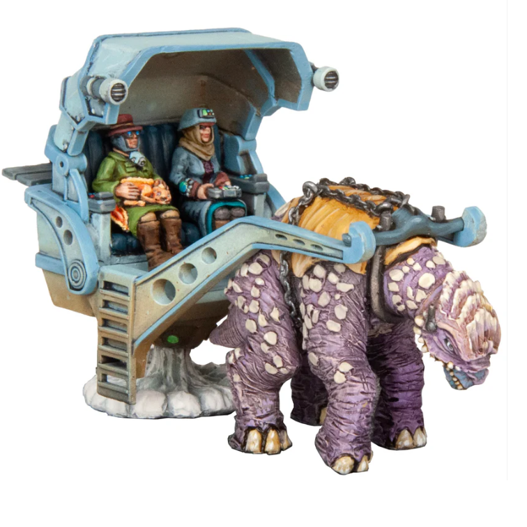 Hover Rickshaw by Crooked Dice, a resin miniature for your tabletop games representing a sci fi looking vehicle being pulled by a four legged dinosaur looking creature and containing two passengers. This kit comes with multiple build options including four different passengers, two rear canopies and stowage options being enough to build one rickshaw in a variety of configurations