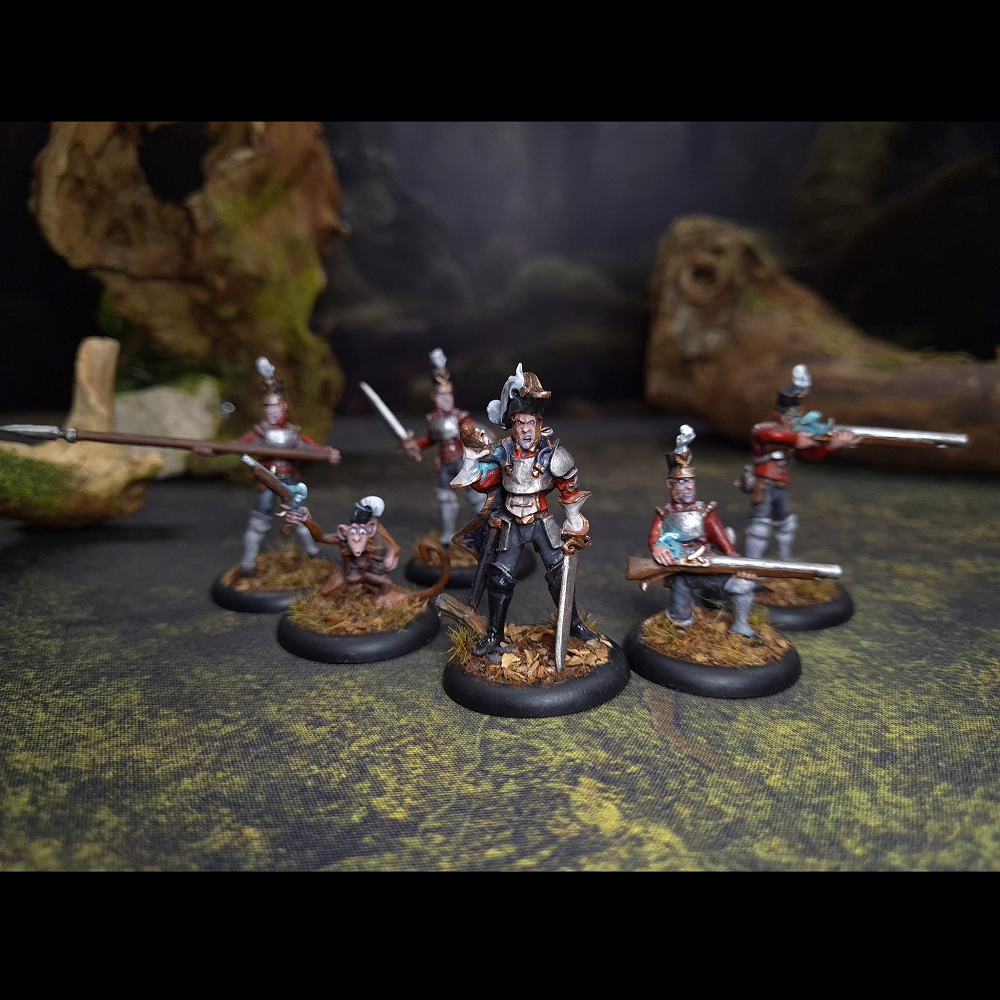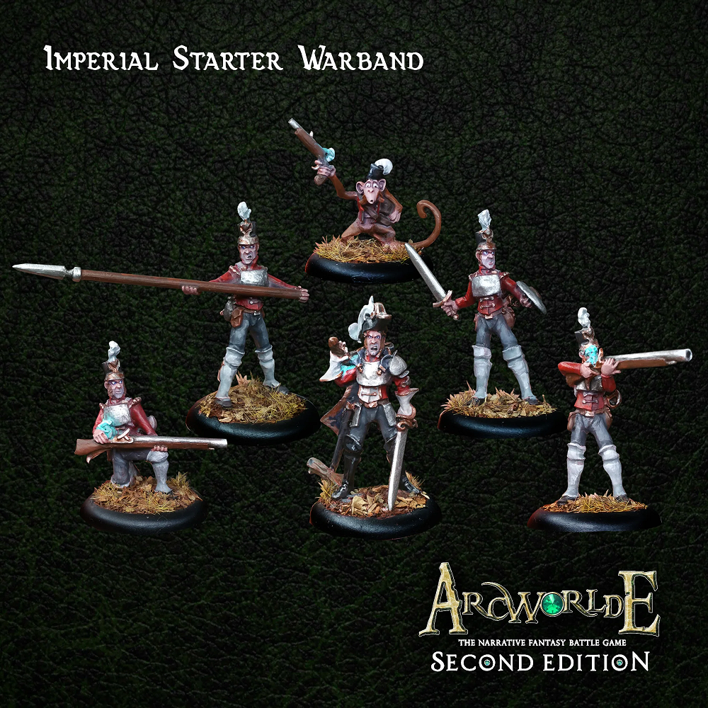 Imperial Starter Warband for ArcWorlde second edition. Full of character these soldiers hold rifles, swords and a spear and even have a monkey with a gun carrying the ammo making a great edition to your tabletop game. This starter warband contains heroic 28mm/32mm scale fantasy miniatures cast in white metal.