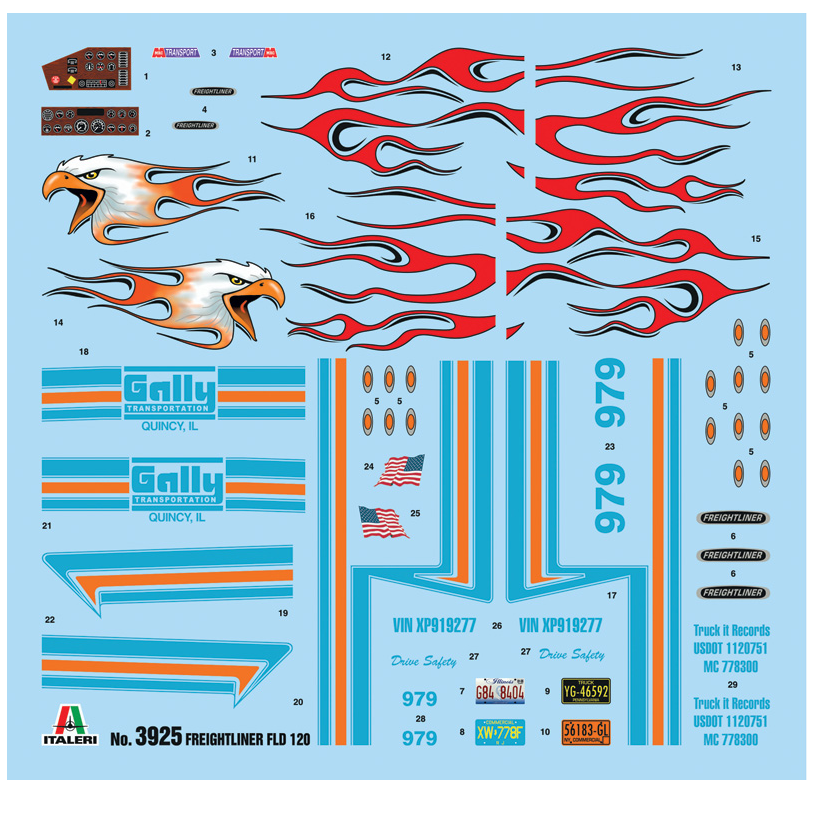 Italeri Freightliner FLD 120 Special scale model kit in 1:24 scale. An Italeri scale model heavy truck with decals for two versions and two chromed sprue.