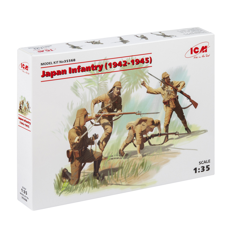 Immerse yourself in World War II history with the ICM Japan Infantry (1942-1945) 1:35 scale plastic model kit. This detailed set includes 69 parts for assembling four figures, featuring an officer and three infantrymen with accurate uniforms from the 1942-1945 period.