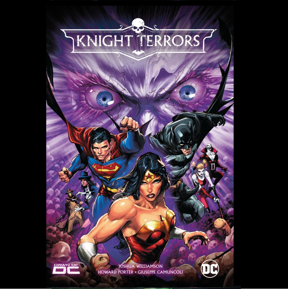 Knight Terrors hardback from DC written by Joshua Williams with art by Casper Wijngaard, Giuseppe Camuncoli, Howard Porter and more. Horror devastates the DC Universe as its greatest heroes confront their worst nightmare in this terrifying epic, perfect for all fans of Batman, Superman, and Wonder Woman! The death of a longtime enemy at the Hall of Justice leads to terrifying events across the DC Universe. Batman, Superman, and Wonder Woman—along with reluctant hero Deadman—take on villainous new foe Insomnia and his Sleepless Knights as the world is engulfed in horror