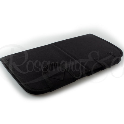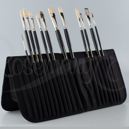 A black case by Rosemary and Co to store your paint brushes. This case has 21 brush pockets to keep your brushes but it also folds out and creates a stand making your brushes easily accessible while painting. The case folds over and secures with Velcro when not in use to make it more compact.
