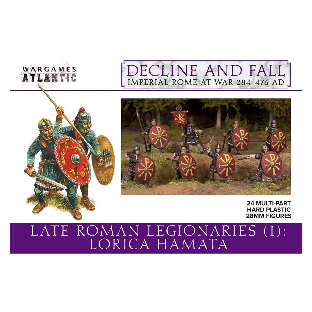 Late Roman Legionaries (1): Lorica Hamata, this 28mm scale army box contains enough components to assemble 24 Roman Legionaries with Spatha, Spear and Plumbata and incorporates optional assembly pieces for two unique bannars plus command for the unit