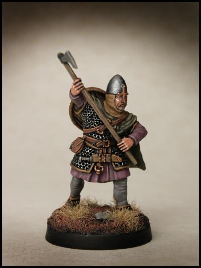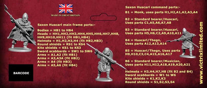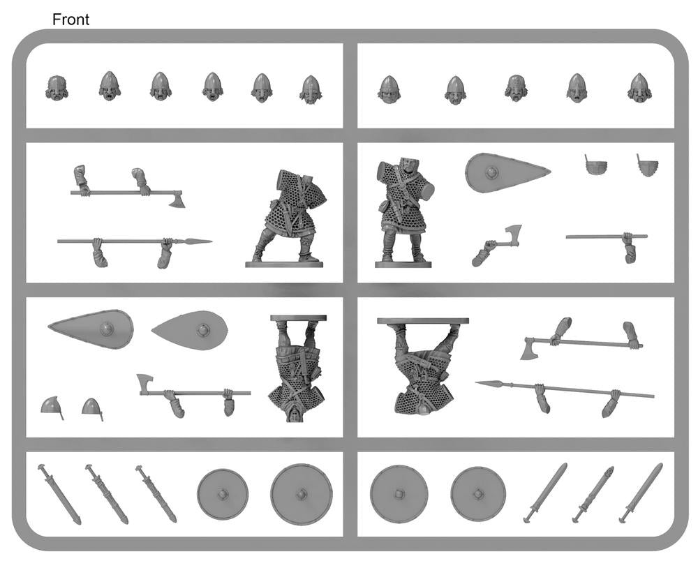 The Huscarls set represent the Saxon warrior elite. Equipped with chain mail, an assortment of helmets, they carry a double handed Dane Axe or can use a spear. You can also use some of the two handed axes on some of the body positions on the Saxon warriors frame thus increasing the amount of variety for your Huscarl figures.