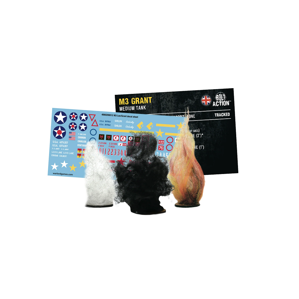 Kit Includes: One unassembled, unpainted M3 Grant tank model, decal sheet, Bolt Action vehicle stat card, and vehicle damage markers.