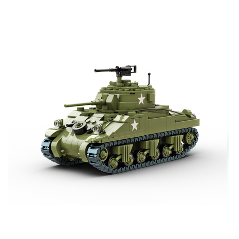 A Build Army M4 Sherman WW2 American medium tank designed by Dr R Zhang. This Lego compatible building block kit has great detail with simple interior structures such as seats, transmission, engine represented and working suspension. Great for Lego enthusiasts, wargamers, educational purposes and hobbyists.