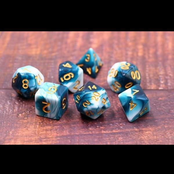 A swirling pattern of beautiful bluey green and white with gold numbers, these Marble Bluey Green Ink dice will look great on your RPG table.