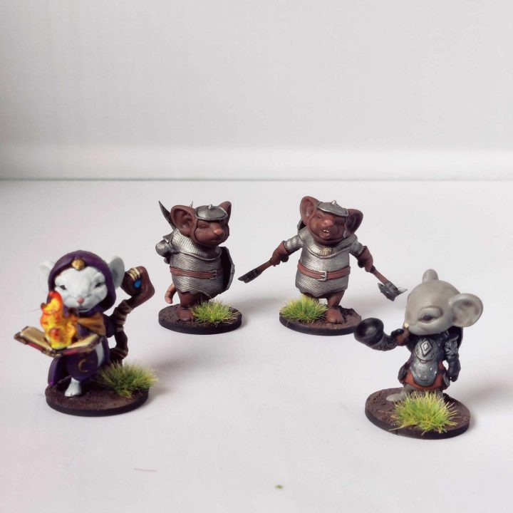Mice Chibis set A by Iron Gate Scenery a set of four 40mm scale printed adventuring mice. These amazingly cute chibi mice are dressed in human clothes and would make a wonderful edition to your RPG adventure as player characters or non player characters (NPC). This set contains four mice, two guards in different poses, a mouse wizard holding a staff in one hand and an open spell book with fire emerging in the other and an armour mouse with a horn to its lips.