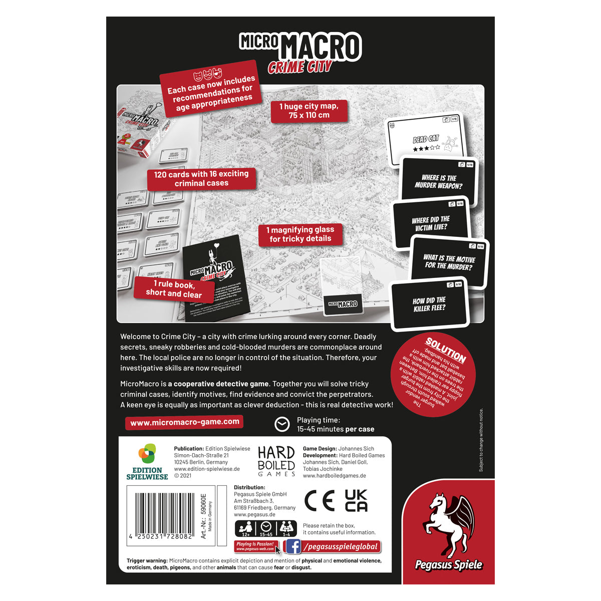 Micro Macro Crime City is a cooperatively played Detective game. Work as a group to piece together the unravelling mysteries of Crime City and solve criminal cases by identifying motives, locating evidence and finally tracking down the perpetrators across a beautifully illustrated cityscape.