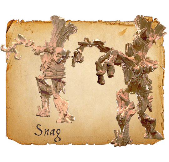 1 x Snag Miniature with Stat Card and Base – a larger tree creature with a fully wooden, non-human appearance, standing on two wooden legs.