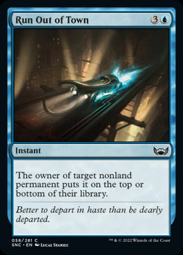 Near Mint Single Run Out of Town Streets of New Capenna collector number #058Common Blue Instant with art by Lucas Staniec