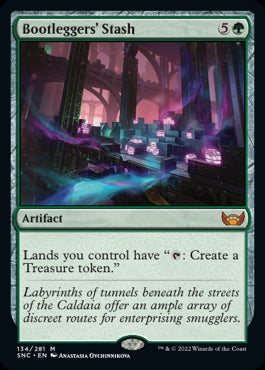 Near Mint Single Bootleggers' Stash Streets of New Capenna collector number #134Mythic Rare Green Artifact with art by Anastasia Ovchinnikova