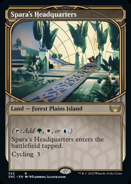 Near Mint Single Spara's Headquarters Showcase Frame Streets of New Capenna collector number #355Rare Colourless Land with art by WFlemming Illustration