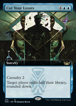 Near Mint Single Cut Your Losses Extended Art Streets of New Capenna collector number #410Rare Blue Sorcery with art by Dominik Mayer