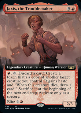 Near Mint Single Jaxis, the Troublemaker Extended Art Streets of New Capenna collector number #425Rare Red Legendary Creature with art by Zoltan Boros